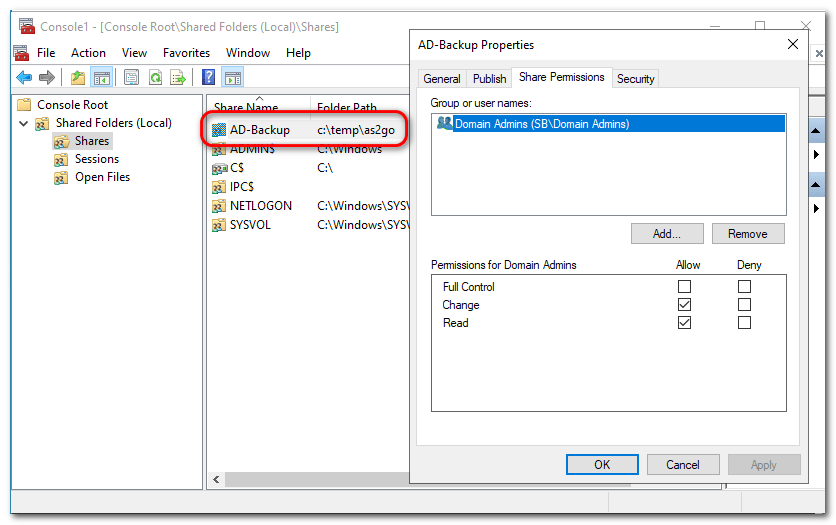 To create the AD-Backup share with CHANGE permission run the following command as administrator