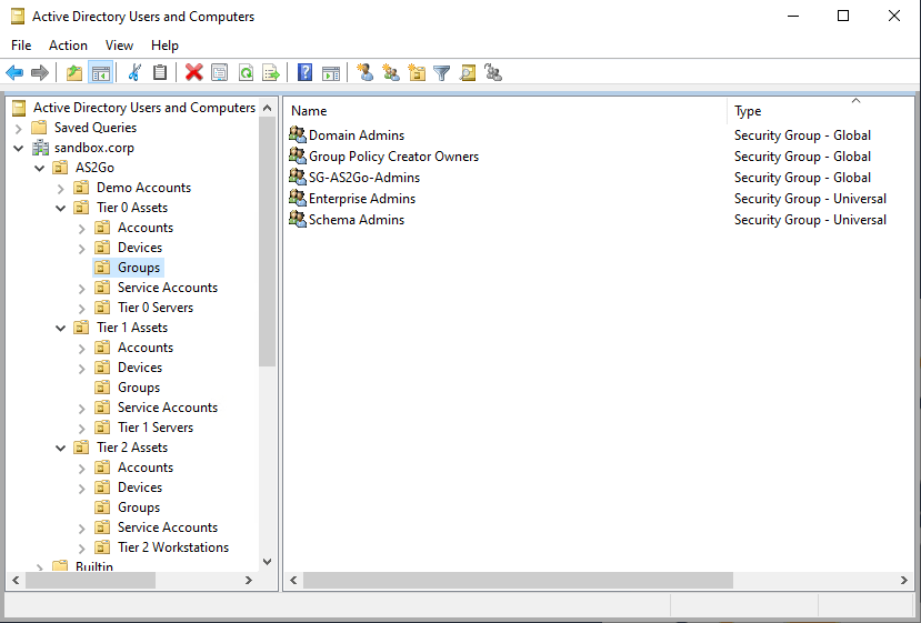 The PoSH script created an entire tiering OU structure under AS2GO,
